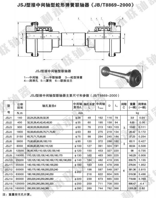 -蛇形彈簧聯軸器,是一種結構 的金屬彈性聯軸器,它靠蛇形彈簧片來傳遞扭矩,蛇形彈簧聯軸器是當今國際機械領 的軸聯接傳動部件,也是一種非常通用的軸聯接傳動部件蛇形彈簧聯軸器共有九類型式,分別是JS罩殼徑向安裝型(基本型)蛇形彈簧聯軸器、J 罩殼軸向安裝型蛇形彈簧聯軸器、JSS雙法蘭聯接型蛇形彈簧聯軸器、JSD單法蘭聯接型蛇形彈簧聯軸器、SJS接中間軸型蛇形彈簧聯軸器、JSG高速型蛇形彈簧聯軸器、JSZ帶制動輪型蛇形彈簧聯軸器、JSP帶制動盤型蛇形彈簧聯軸器、JSA安全型蛇形彈簧聯軸器等。